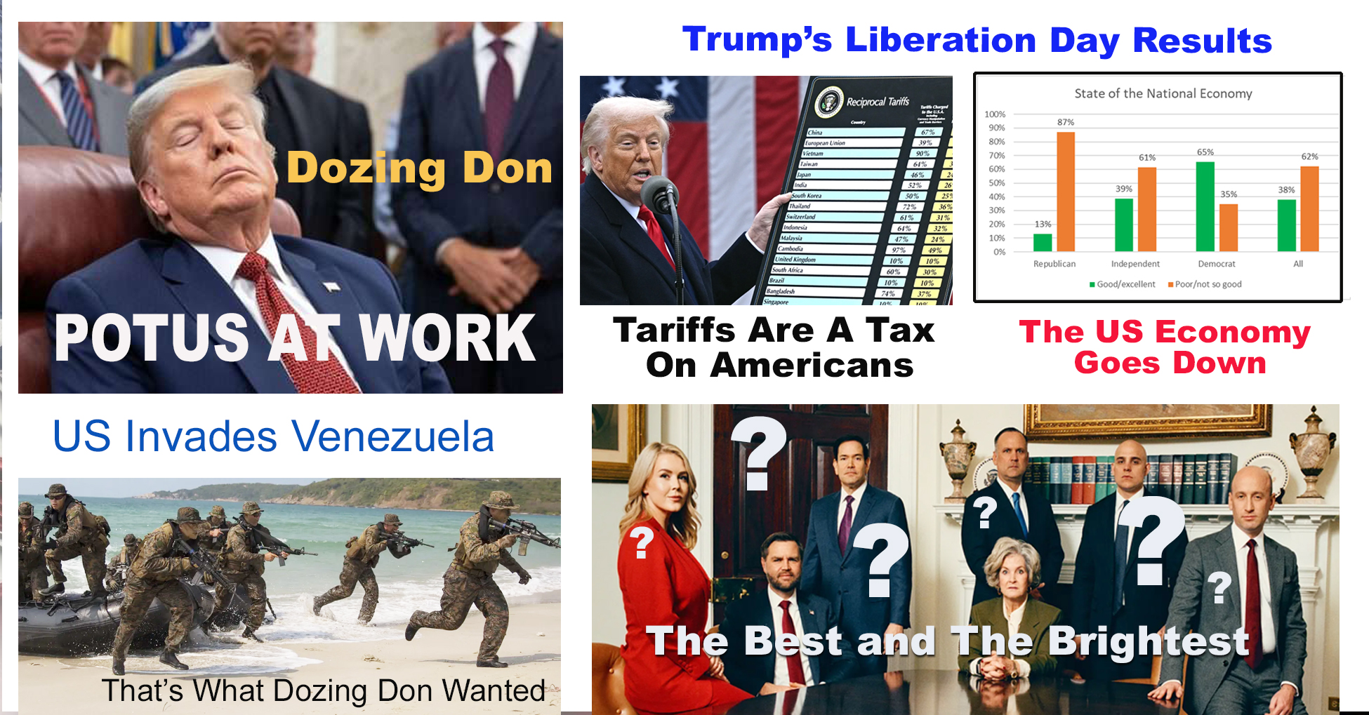 - Appointed many unqualified idiots to cabinet positions, who kiss his ring on a daily basis.